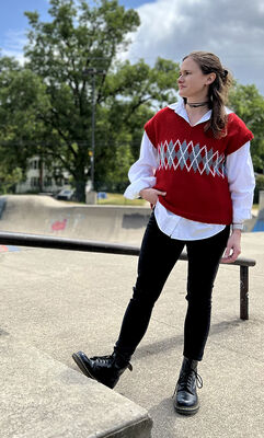 This free knitting pattern uses worsted-weight yarn. Pattern attributes and techniques include: In-the-round, Stranded, V-neck.