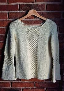 A free knitting pattern using dk-weight yarn. Pattern attributes and techniques include: Boatneck, Lace, Long Sleeve, Seamed.