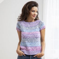 This free knitting pattern uses worsted-weight yarn. Pattern attributes and techniques include: Lace pattern, Round Neckline, Round Yoke, Seamless, Short Sleeves, Top-Down.