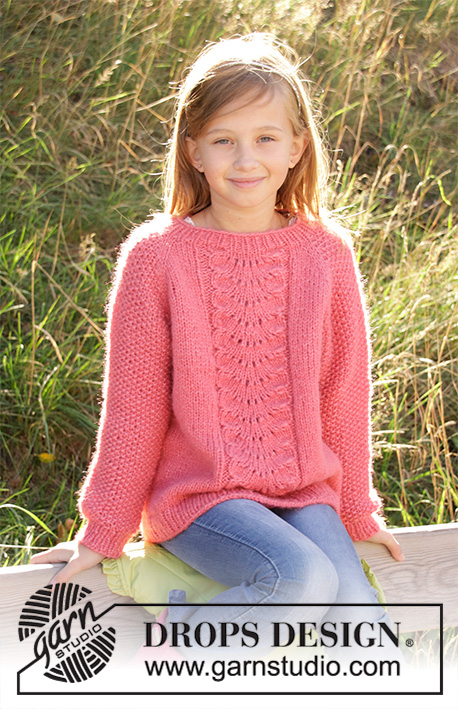 Free girls knitting pattern using aran-weight yarn. Pattern attributes and techniques include: Lace pattern, Long Sleeve, Raglan, Round Neckline, Seamless, Top-Down.