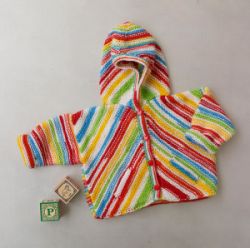 A free knitting pattern using sport-weight yarn. Pattern attributes and techniques include: Garter Stitch, Hood.
