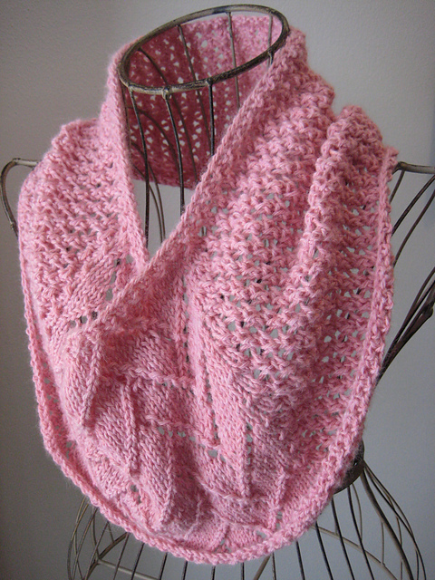 Free knitting pattern using worsted-weight yarn. Pattern attributes and techniques include: In-the-round, Lace, Seamless.