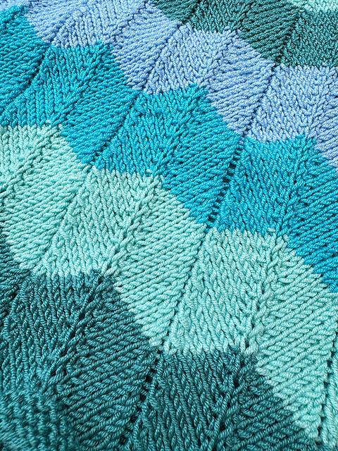 Free knitting pattern using worsted-weight yarn. Pattern attributes and techniques include: Chevron, Stripes.