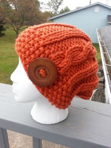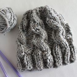 A free knitting pattern using super bulky-weight yarn. Pattern attributes and techniques include: Cable, In-the-round.