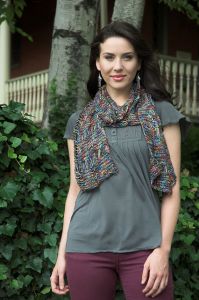 Free knitting pattern using bulky-weight yarn. Pattern attributes and techniques include: Drop stitch, Lace.