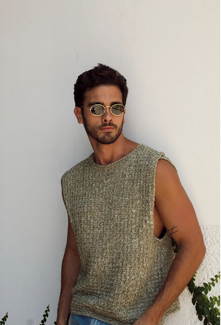 This free men's knitting pattern uses dk-weight yarn. Pattern attributes and techniques include: Sleeveless.