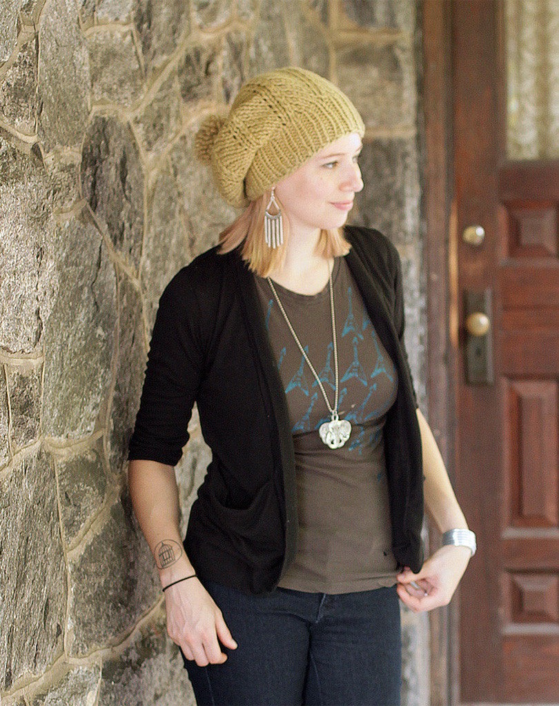 A free knitting pattern using bulky-weight yarn. Pattern attributes and techniques include: Seamless.