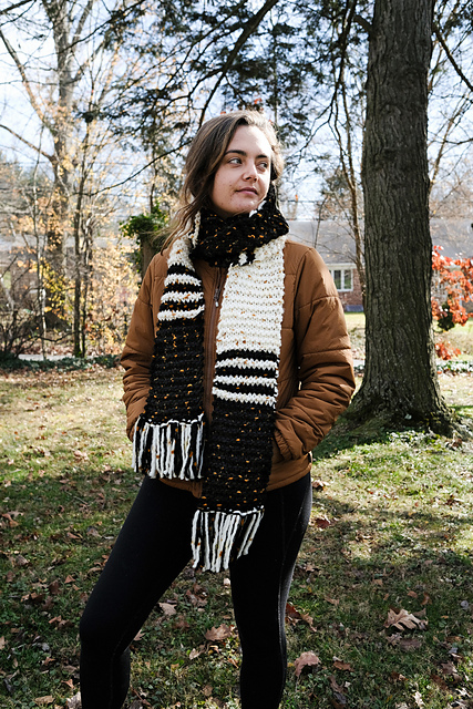 Free knitting pattern using super bulky-weight yarn. Pattern attributes and techniques include: Stripes.