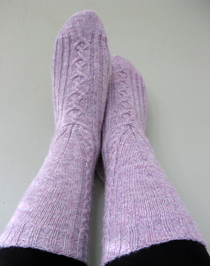Free knitting pattern using fingering-weight yarn. Pattern attributes and techniques include: Cable.