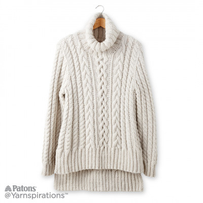 This free knitting pattern uses aran-weight yarn. Pattern attributes and techniques include: Cable, Long Sleeve, Seamed, Set-in Sleeve, Turtleneck, Vent.