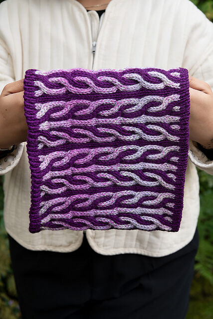 A free knitting pattern using aran-weight yarn. Pattern attributes and techniques include: Cables, In-the-round.