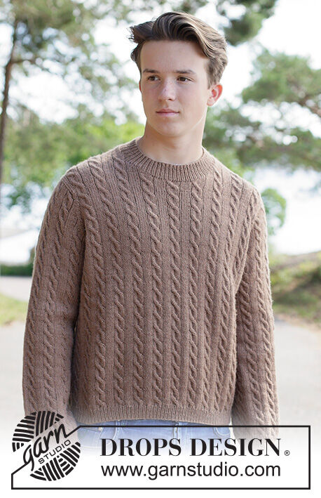Free men's knitting pattern using dk-weight yarn. Pattern attributes and techniques include: Cables, European yoke, Top-Down.